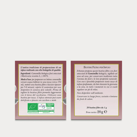 Bustine filtro pratiche, ciascuna contenente Fiori di Camomilla biologica selezionati con cura, sigillate singolarmente per preservarne intatti aroma e proprietà naturali. Ideali per concedersi più tazze di infuso profumato durante la giornata o un momento di relax serale prima di coricarsi.