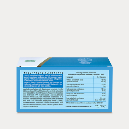 Integratore a base di Schisandra e Codonopsis, piante ad attività tonico-adattogena, in associazione con Bacopa, che aiuta memoria e funzioni cognitive, e Withania, che favorisce le naturali difese dell’organismo ed un fisiologico rilassamento e benessere mentale. Completa la formula la Vitamina C (estratto di Rosa canina) che contribuisce alla riduzione della stanchezza e dell’affaticamento e alla protezione delle cellule dallo stress ossidativo.