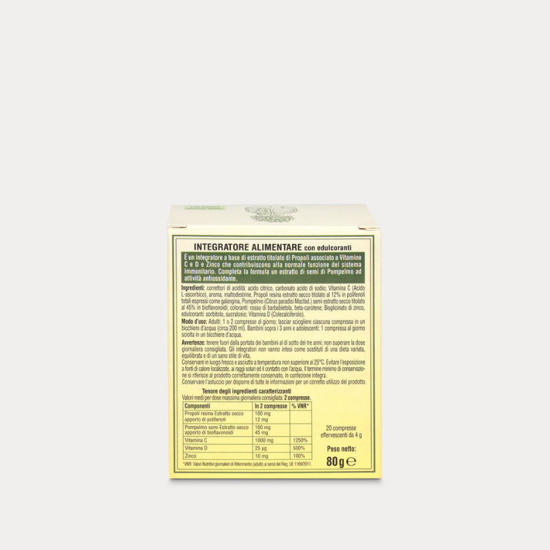 Questo integratore alimentare è a base di estratto titolato di Propoli associato a Vitamine C e D e Zinco che contribuiscono alla normale funzione del sistema immunitario. Completa la formula un estratto di semi di Pompelmo ad attività antiossidante.