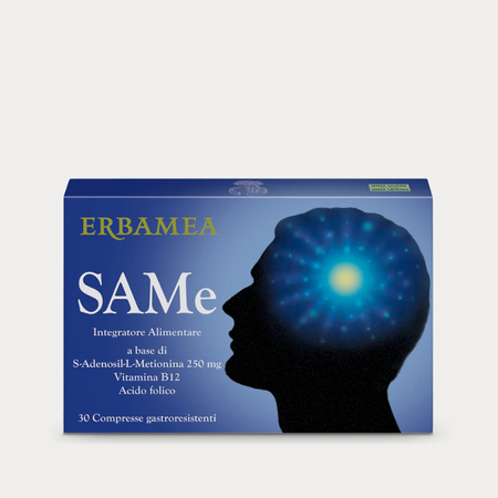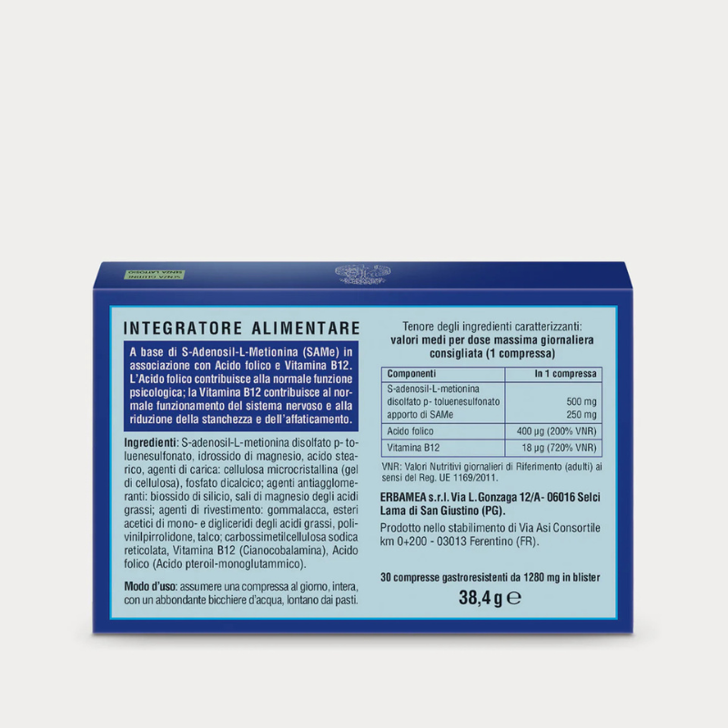 Per supportare il benessere psicologico, Erbamea propone un integratore formulato con S-Adenosil-L-Metionina (SAMe), in associazione ad Acido folico e Vitamina B12. L’Acido folico contribuisce alla normale funzione psicologica, mentre la Vitamina B12 supporta il corretto funzionamento del sistema nervoso e aiuta a ridurre stanchezza e affaticamento, favorendo una migliore vitalità quotidiana.